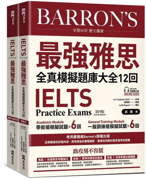 Barron's Educational Services成立超過80年,與時俱進的快速更新以因應不斷改變的考試內容,深受全球需要取得證照及語言檢定的考生信賴,是初次備考雅思的首選書籍。