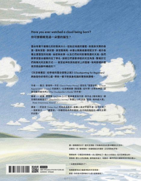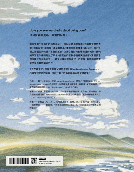 從〈如果雲知道〉到〈一首雲的時間〉 歌手 許茹芸 的第一本翻譯作品 成為一名小小的「觀雲者」 喚起好奇心、啟發自然之美 英國「賞雲協會」創辦人 蓋文.普瑞特─平尼 「凱特.格林威」童書繪本大獎插畫家威廉.葛里爾 ————共同獻上———— 兼具藝術與知識性的「雲」科普繪本! ◎歌手 許茹芸 的第一本翻譯作品 「從小我就喜歡躺在草地上,仰望天空,看著雲朵一朵朵變化——從形到影,從近到遠。 那份飄浮不定的自由,彷彿呼應著內在的心與靈魂。 願每個讀完的你,都能隨著心的流動與能量,像雲一般——在變化中飄浮,在流動中安靜。」 ———————許茹芸 ◎你可曾親眼見過一朵雲的誕生? 雲朵有著千變萬化的形態與大小,從貼近地面的層雲,到高掛天際的卷雲,還有滾雲、旗狀雲,甚至龍捲風。本書以精美插畫搭配文字,揭示各種主要雲型的知識、祕密與故事,以及它們如何影響周遭的天氣、拉出天空的輪廓、與陽光共舞。 我們將學習雲朵優雅的拉丁學名,探索它們喜歡停駐的天空角落,驚嘆於它們與陽光的互動方式——甚至延伸到其他星球上的奇異雲層,有時那裡的雲竟然是由酸所構成的?又或是木星上的雲是帶有氨冰晶?而土星的北極雲層竟聚集成一個神祕的六邊形? 《天空尋寶記:初學者的雲朵冒險之旅》(Cloudspotting for Beginners)將啟發你好奇的心靈,帶來一輩子對氣象知識的驚奇與讚嘆。 ◎一本插畫精美的雲科普繪本,帶你探索雲的奧祕與壯麗之美。 《天空尋寶記:初學者的雲朵冒險之旅》不只是一本詩意的雲與天空繪本,也是一本滿足讀者初探氣象知識的科普書,更是一本能帶領你進入「雲朵奇幻世界」的入門指南,喚起好奇心、啟發自然之美,任何對天空和雲朵充滿好奇心與想像力的大朋友和小朋友們,都會愛上這本兼具藝術與知識性的美麗圖文作品。 由英國「賞雲協會」創辦人蓋文.普瑞特─平尼(Gavin Pretor–Pinney),與榮獲「凱特.格林威」童書繪本大獎插畫家威廉.葛里爾(William Grill)聯手打造,以深入淺出的文字敘述,為你解說各種變幻莫測的雲朵奧秘與知識,搭配以壯麗彩色天空與流動雲朵的色鉛筆插畫風格,營造出沉靜而引人深思的閱讀體驗。 雲的存在需要極為精準的化學條件,卻又在日常中不斷生成與消散。本書以趣味的筆調,描繪這些常被你我忽略的天空生靈,提醒我們在無常之中,學會專注與觀察。 這是一本結合知識、詩意與寧靜之美的雲朵之書,獻給所有熱愛天空與自然的讀者。 ◎獎項肯定 入圍 2024 年英國「水石書店年度圖書獎」(Waterstones Book of the Year)決選名單 入圍英國「溫萊特兒童非小說獎」(Wainwright Prize for Children’s Non-Fiction)決選名單