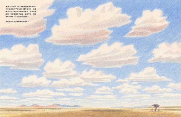 你可曾親眼見過一朵雲的誕生? 選一個晴朗的日子,當天空湛藍,只有幾朵白白的雲朵飄散在天空中,試著找一找,看哪裡有一抹最輕最淡的雲影,正在悄悄地浮現。剛開始時,它看起來就像是一朵小雲伸出了一點小小的指尖,從天空裡冒出來。 漸漸地,那小小的白點點,變得越來越大,堆疊成一團閃閃發光耀眼明亮的雪白雲山。一朵雲就這樣誕生了! 你很快就能辨認出,它屬於10 種主要雲型中的哪一種。每種雲都有自己偏愛停駐的天空角落。它們也都擁有一個獨特的拉丁文名字。 那麼,你的這朵雲將會幻化成什麼模樣呢?