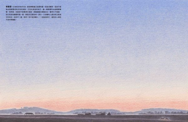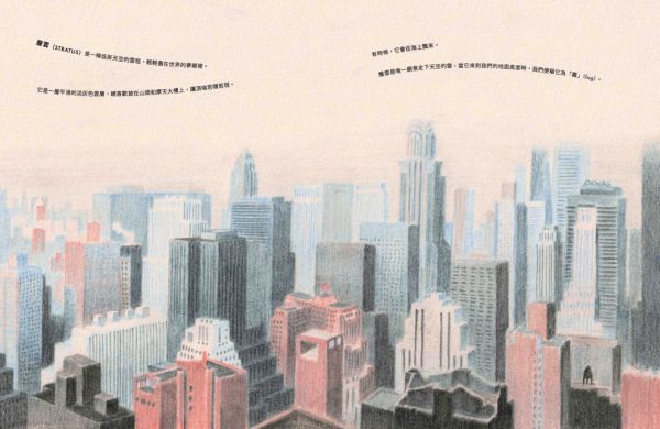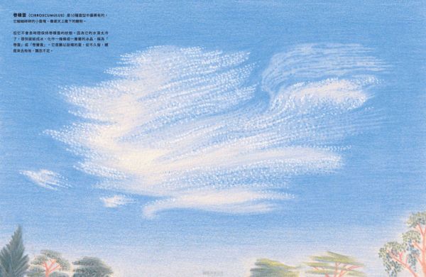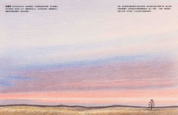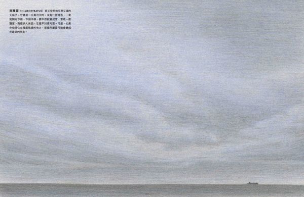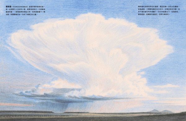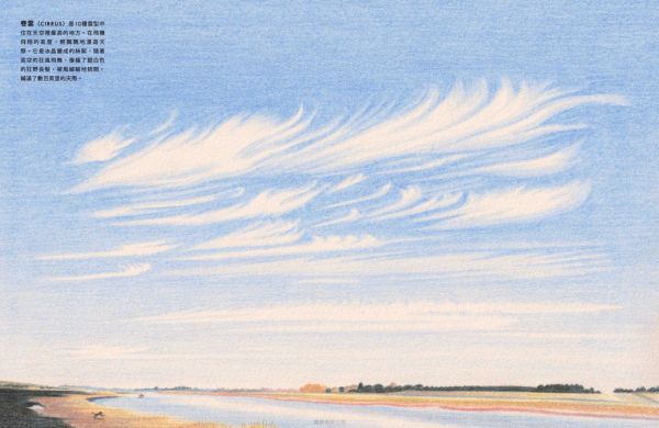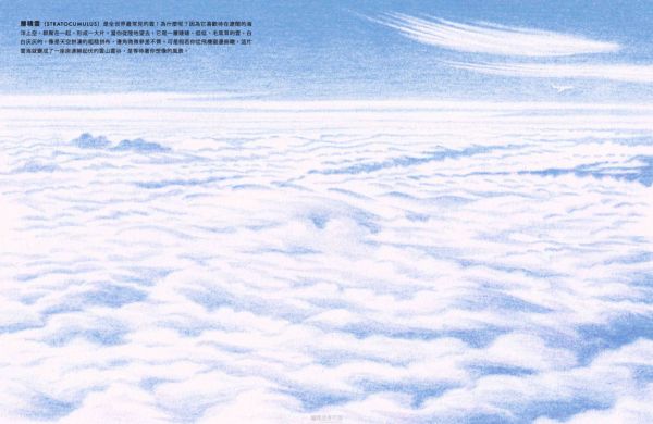 ◎積雲(CUMULUS)是最無憂無慮的雲朵。它在晴朗的日子裡出現,飄在低空中,乘著暖洋洋的太陽光托起的隱形氣柱,悠悠地漫遊著。它有著清晰的邊緣,底部平坦,頂端隆起,像極了一朵白色的花椰菜。誰能不愛這些快樂無憂的積雲呢? ◎層積雲(STRATOCUMULUS)是全世界最常見的雲!為什麼呢?因為它喜歡待在遼闊的海洋上空,群聚在一起,形成一大片。當你從陸地望去,它是一層矮矮、低低、毛茸茸的雲,白白灰灰的,像是天空拼湊的粗糙拼布,邊角微微參差不齊。可是假若你從飛機窗邊俯瞰,這片雲海就變成了一座座連綿起伏的雲山雲谷,是等待著你想像的風景。 ◎層雲(STRATUS) 是一條低掛天空的雲毯, 輕輕蓋在世界的夢郷裡。它是一層平滑的淡灰色雲層,總喜歡披在山頭和摩天大樓上,讓頂端若隱若現。有時候, 它會從海上飄來。層雲是唯一願意走下天空的雲, 當它來到我們的地面高度時, 我們便稱它為「霧」(fog)。 ◎高積雲(ALTOCUMULUS)是中雲的一種:比低雲高,比高雲低。它總是一團團排好,稱為「小雲塊」(cloudlets)。高積雲喜歡將這些小雲塊排列得井然有序,可以鋪滿整個天空。它是喜歡整潔的雲。 ◎高層雲(ALTOSTRATUS)可能有點悶。不是想故意說它無聊,但它確實沒有太多特色。灰灰的一大片,靜靜地掛在天上,沒什麼可說的。高層雲最令人興奮的時候就是灑下一點毛毛細雨。可是,每朵雲終究還是會有它發光的時刻。當太陽升起或夕陽落下時,這片原本沉悶的雲畫布,忽然被金色的筆刷輕輕塗抹,染上一抹紅,一抹紫,閃閃發亮。可是不久後,光芒退去,它又回到平淡無奇的樣子。 ◎卷雲(CIRRUS)是10種雲型中住在天空裡最高的地方。在飛機飛翔的高度, 輕飄飄地漫遊天際。它是冰晶變成的絲絮,隨著高空的狂風飛舞,像極了銀白色的狂野長髮,被風細細地梳開,鋪滿了數百英里的天際。 ◎卷積雲(CIRROSCUMULUS)是10種雲型中最稀有的。它細細碎碎的小雲塊,像是天上撒下的糖粉。但它不會長時間保持卷積雲的狀態。因為它的水滴太冷了,很快就結成冰,化作一條條或一層層的冰晶,稱為「卷雲」或「卷層雲」。它是難以捉模的雲,從不久留,總是來去匆匆,飄忽不定。 ◎卷層雲(CIRROSTRATUS)是安靜害羞又低調的雲。但這沒關係,因為不是每朵雲都要成為天空的焦點。它住在高高的地方,像一層薄薄的冰晶輕輕鋪開,有時候,你甚至不會覺得它是雲,更像是藍天微微泛白。雖然它不張揚,但它和其他種類的雲一樣,都是天空雲朵的一部分。大多數的人都沒有注意過它的存在,但你不一樣,對吧?你不是多數人,一定能找到它,看見別人視而不見的卷層雲。 ◎雨層雲(NIMBOSTRATUS)是天空那條又厚又濕的大毯子。它總是一片黑沉沉的,沒有什麼特色,一來就開始下雨,下個不停,要不然就變成雪,雪花一直飄落。對很多人來說,它是不討喜的雲。可是,如果你恰好住在極度乾燥的地方,那麼雨層雲可能會變成你最好的朋友。 ◎積雨雲(CUMULONIMBUS)是雲界裡的搖滾巨星。每一朵想要引人注目的小雲,都夢想成為它。它是最高最高的雲,一登場就帶來傾盆大雨,有時還會撒下一陣冰雹,伴隨雷電交加,只為了炫耀它的力量。積雨雲的頂部常常向外展開,看起來像一朵巨大的蘑菇。從遠處看,它靜靜地飄浮在天空中,彷彿安詳而沉穩。但你千萬別被它的外表騙了!在它的風暴之下,狂風怒吼,暴雨傾瀉,這種雲可是陰沉、狂野又憤怒的。