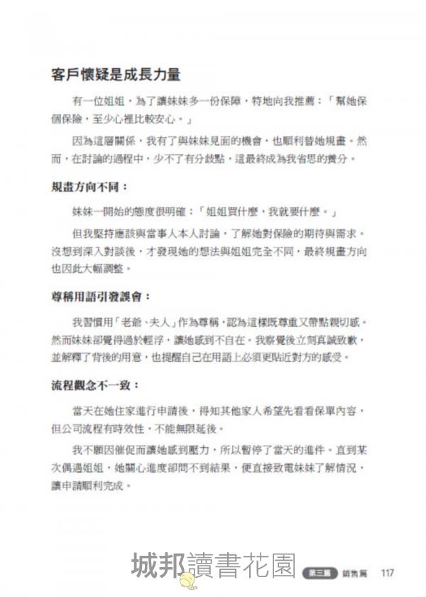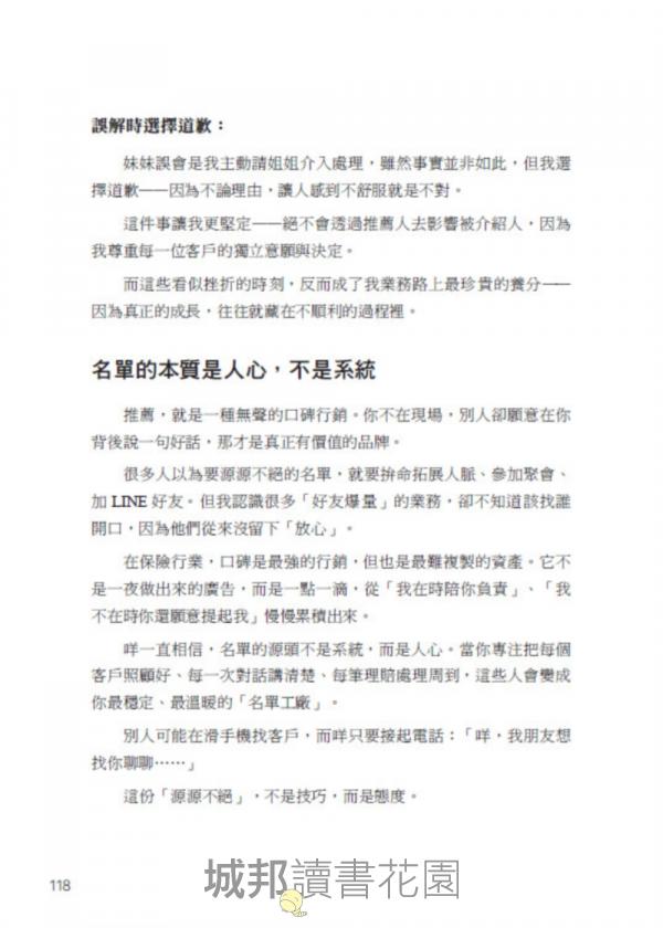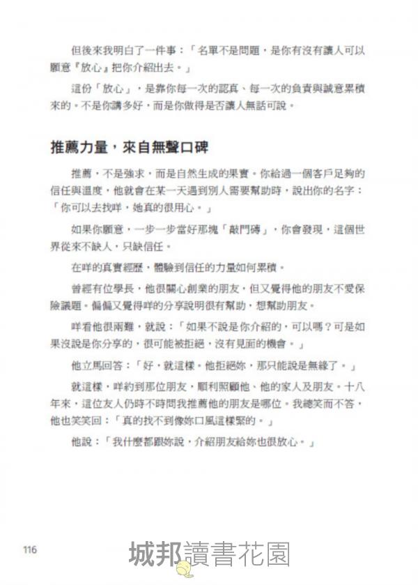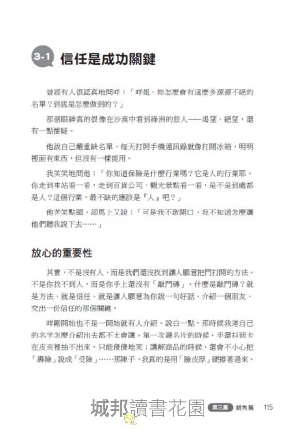 讀者面前的這本書講述的就是這樣的故事,不像許多技巧書、工具書,可能有花俏的戰術,但真正用在業務戰場上不一定可以落實,小咩在這本書的親身經歷,卻是人人可學,畢竟,小咩就告訴讀者了,她自己不是個甚麼聰明伶俐的業務人,她可以做到,每個人也都可以做到。