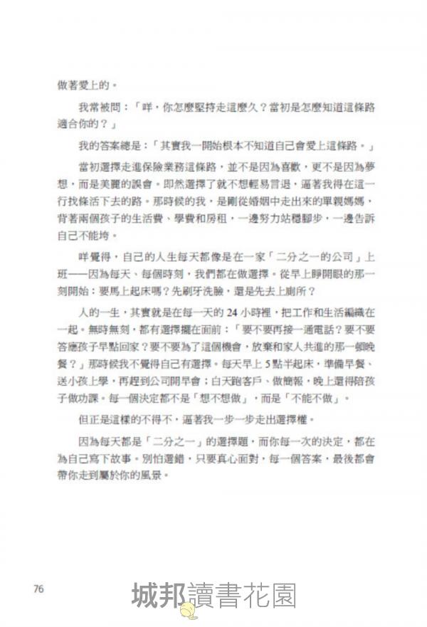 本書集結了美吟近二十年來在壽險業務一線的經驗與智慧。她以真摯溫暖的語調,細膩描繪出壽險顧問這份工作的美好與價值,也誠懇分享她一路走來的掙扎與成長。她用自己的故事激勵讀者:「不要怕從零開始,只要願意學習與堅持,就能在人生的路上創造不凡。」