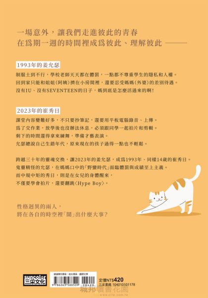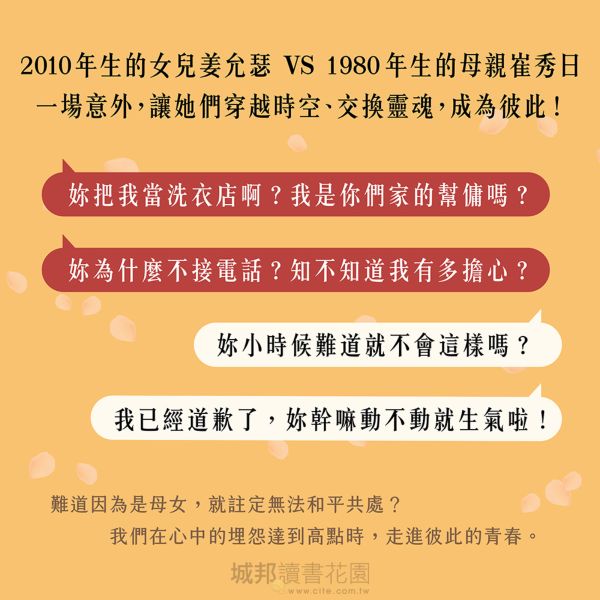 全球累銷破百萬冊、《82年生的金智英》趙南柱作家 最溫暖的跨世代療癒小說 寫給偶爾「有點討厭」女兒的妳 ──── 【 獨家收錄!趙南柱給臺灣讀者的親筆祝福 】 難道因為是母女,就註定無法和平共處? 我們在心中的埋怨達到高點時,走進彼此的青春。 ✷ 連續23週YES 24分類榜TOP 100 ✷ 教保文庫讀者10星滿分好評 ✷ 入選韓國國高中晨讀書單 ✷《韓國日報》《韓民族日報》《京鄉新聞》推薦選書 ✷ 繁中版獨家:作者序、趙南柱作家印簽扉頁 「妳把我當洗衣店啊?我是你們家的幫傭嗎?」 「妳小時候難道就不會這樣嗎?」 「妳為什麼不接電話?知不知道我有多擔心?」 「我已經道歉了,妳幹嘛動不動就生氣啦!」 到底是青春期的女兒太難懂,還是更年期的媽媽太難搞? 2010年生的女兒姜允瑟 VS 1980年生的母親崔秀日 一場意外,讓她們穿越時空、交換靈魂,成為彼此! >> 允瑟穿越回30年前,成為1993年14歲的母親 >> 秀日則到了2023年的14歲女兒身體裡 1993年的姜允瑟──── 制服土到不行,學校老師天天都在體罰,一點都不尊重學生的隱私和人權。 回到家只能和姐姐(阿姨)擠在小房間裡,還要忍受媽媽(外婆)的差別待遇。 沒有IU、沒有SEVENTEEN的日子,媽到底是怎麼活過來的啊! 2023年的崔秀日──── 課堂內容變難好多,不只要抄筆記,還要用平板電腦錄音、上傳。 為了交作業,放學後也沒辦法休息,必須跟同學一起拍片和剪輯。 剩下的時間還得拿來練舞,準備才藝表演。 允瑟總說自己生錯年代,原來現在的孩子過得一點也不輕鬆。 跨越三十年的靈魂交換,讓2023年的姜允瑟,成為1993年、同樣14歲的崔秀日。 鬼靈精怪的允瑟,在媽媽口中的「野蠻時代」面臨體罰與成績至上主義。 而中規中矩的母親秀日,則是在女兒允瑟的身體醒來,不僅要學會拍片,還要上台翻跳〈Hype Boy〉。 性格迥異的兩人,將在各自的時空裡「鬧」出什麼大事? ▌從社會觀察家趙南柱,到家有青少年的母親趙南柱 《82年生的金智英》道出女性在職場與育兒的雙重困局,成為全球現象級的暢銷書。 如今,女兒進入青春期,趙南柱作家也面臨全新的母女關係難題。 一如她在作者序中的自述: 「在我的內心深處,身為孩子的缺失感與身為父母的空虛感並存。 我無法確定哪一種感受更強烈、更痛苦。」 故事裡的母親秀日,也對女兒抱持著矛盾的情感。 透過《讓我成為妳》,趙南柱寫下自己的日記,同時也構成一封給女兒的信。