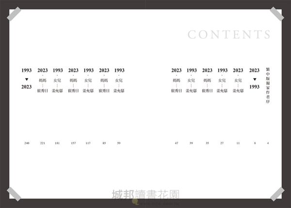 繁中版獨家作者序 2023 ▶ 1993 2023.女兒.姜允瑟 1993.女兒.姜允瑟 2023.媽媽.崔秀日 1993.女兒.姜允瑟 2023.媽媽.崔秀日 1993.女兒.姜允瑟 2023.媽媽.崔秀日 1993.女兒.姜允瑟 2023.媽媽.崔秀日 1993.女兒.姜允瑟 2023.媽媽.崔秀日 1993 ▶ 2023