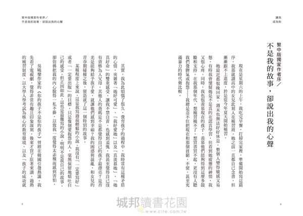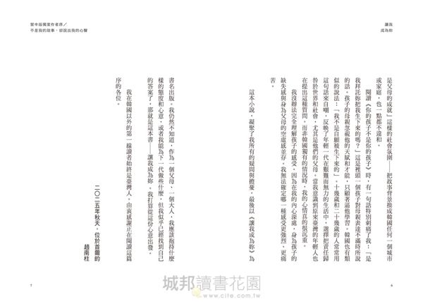 繁中版獨家作者序/ 不是我的故事,卻說出我的心聲 現在是星期六的上午,我吃完早餐,打掃完家裡,準備開始寫這篇序。我那就讀高中的女兒此刻人在補習班。她之前一直都自己念書,但漸漸跟不上進度,於是從今年夏天開始補習。 她最近都很晚回家,週末也無法好好休息,整個人變得敏感又易怒。有時我會懷疑她是不是真的在認真學習,但看到她疲憊的神情,我又很心疼。同時,我也很羨慕現在的孩子,羨慕他們能夠得到這麼多鼓勵和支持。在我那個年代,想補習補不了、想買書買不起,更沒有人聽我們發脾氣或抱怨……我總是忍不住把現在和那個貧窮、不便,甚至充滿暴力的時代做比較。 其實,我為此煩惱了很久。養育孩子的過程中,我時常有這種矛盾的心情。夾雜著「她好可愛」、「我好愛她」以及「真羨慕她」、「她真好命」的雙重感受,讓我不禁自責,也感到羞愧。我甚至覺得自己沒有資格為人父母。其他人的爸媽是不是都覺得自己的孩子最漂亮?是否光是能夠給予孩子愛,就讓他們感到幸福?我的困惑與混亂,和女兒的青春期碰撞之後,便造就了這一個特別的故事。 某種程度上來說,這是我寫過最輕鬆的小說。我沒有「一定要寫好」或者「一定要出版」的目標,只是像個愛抱怨的人,毫無保留地傾吐自己的感受。但正因如此,這也是最難寫的小說。明明不是我自己的故事,卻彷彿把我的內心脫得一私不掛,以致我一度覺得太赤裸而感到害怕。 吳曉樂作家的《你的孩子不是你的孩子》曾經在韓國引發熱議。我先看了電視劇,覺得非常有趣且印象深刻,後來才買了原著來讀。過熱的補習制度、以大學入學考試為核心的教育環境,以及「孩子的成功就是父母的成就」這樣的社會氛圍──把故事背景換成韓國任何一個城市或家庭,也一點都不違和。 閱讀《你的孩子不是你的孩子》時,有一句話特別刺痛了我:「是我拜託妳把我生下來的嗎?」這是裡頭一個孩子對母親表達不滿時所說的話。孩子的母親忽視他的天賦和才能,只顧著逼他學習。韓國也有類似的說法:「我不是自願被生下來的」。十幾歲和二十幾歲的人常常用這句話來自嘲,反映了年輕一代在艱難而無力的生活中,選擇把責任歸咎於世界和社會,尤其是他們的父母。當我意識到原來臺灣的年輕人也在提出這種質問,而非韓國獨有的情況時,我的心情真的很沉重。 我沒辦法完全理解孩子的感受。因為在我的內心深處,身為孩子的缺失感與身為父母的空虛感並存。我無法確定哪一種感受更強烈、更痛苦。 這本小說,凝聚了我所有的疑問與擔憂,最後以《讓我成為妳》為書名出版。我仍然不知道,作為一個父母、一個大人,我應該抱持什麼樣的態度和心意,或者我能為下一代做些什麼,但我似乎已經找到自己的答案了,那就是這本書──讓我成為妳 。我打算從這份心意出發。 我在韓國以外的第一線讀者始終是臺灣人。由衷感謝正在閱讀這篇序的各位。 2025年秋天,位於首爾的 趙南柱