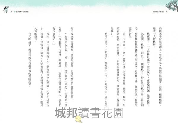 為了讓這些「神祕的幻想」更貼近「真實的夢境」,作者用心挑選了一篇篇經典古文:無論是繽紛的桃樹、酸澀的棗子,還是避邪的桃木、裝飾的玉葉,每一位活潑繆思的背後都有經典古文源頭出處,讓童話故事不再是枕邊囈語,而是扎實的閱讀訓練。