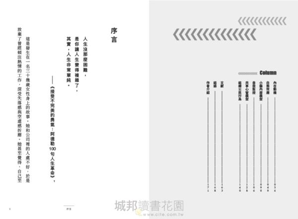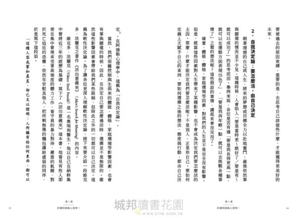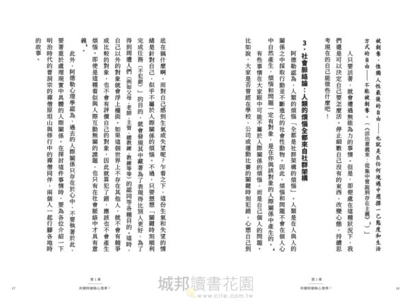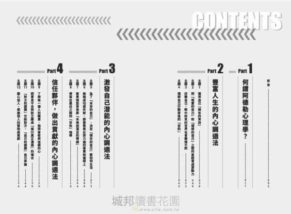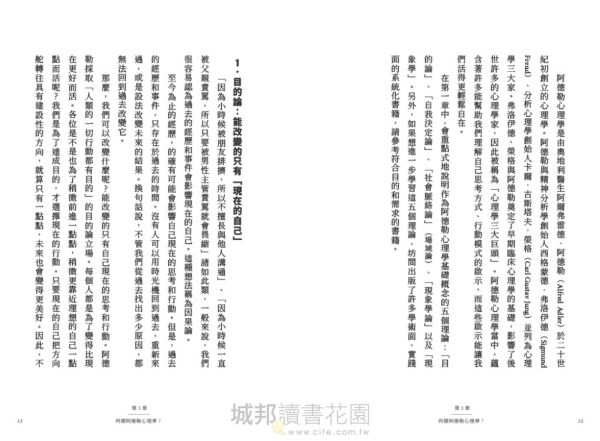 序言 Part1 何謂阿德勒心理學? Part2 豐富人生的內心調適法 .主題1 運用自己「擁有的東西」 .主題2 把「現實的自己」和「理想的自己」之間的差距當成原動力 .主題3 改變自己,眼中所見的世界也會變得不同 .主題4 理解自己行動背後的「目的」 Part3 激發自己潛能的內心調適法 .主題5 為了「未來的自己」,決定「現在的自己」要如何生活 .主題6 無論成功或失敗,都要聚焦在努力過的事實和過程上 .主題7 察覺憤怒背後那「未得到滿足的情緒」 .主題8 停留在黑白之間的「灰色」地帶 Part4 信任夥伴,做出貢獻的內心調適法 .主題9 了解每一個人的職責,抱持尊敬與信賴的心 .主題10 把意見不合和對立變成「進行真正溝通」的場合 .主題11 「對方的課題」交給對方,「自己的課題」自己承擔 .主題12 關心他人,感謝他人的幫助與貢獻 Column .內在動機 .白熊效應 .小腦內部模型 .自我監控 .共享心智模型 .組織公民行為 文獻 結語 作者介紹