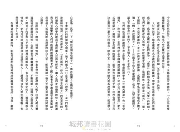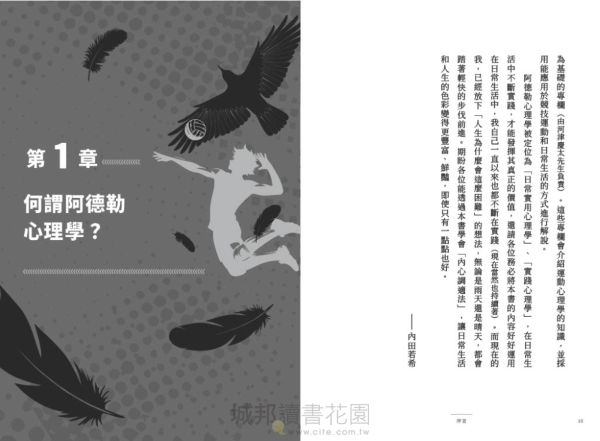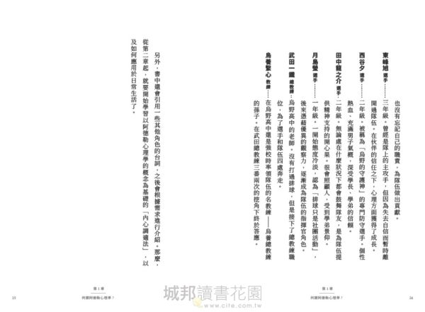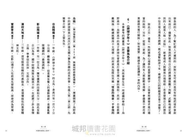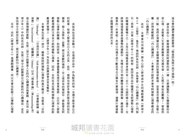 序言 人生沒那麼困難,是你讓人生變得複雜了,其實,人生非常單純。 (《接受不完美的勇氣:阿德勒100句人生革命》) 這是發生在一名三十幾歲女性身上的故事。她和公司裡的人處不好,於是放棄了曾經傾注熱情的工作,深受失落感與空虛感折磨。她甚至覺得,自己至今為止付出的努力,那些奮力拚搏的時光,全都是沒有意義的。「人生為什麼這麼困難呢?」她在心中反覆叨念著這句話…… 這就是以前的我。或許也是某段時期(也可能是現在)的你。 人只要活著,就會遭遇各式各樣的困境和難題。即使是在追尋自己的夢想或目標,或是認真鑽研喜歡的事物,「痛苦」的時間也會多過「快樂」的時間。而我們會無數次陷入迷惘,有時候還會受傷。這種時候,就像是「雨天」一樣。下雨時,天空灰濛濛的,走在外面會被雨淋濕,氣壓的變化甚至會造成身體不適。「啊,真討厭雨天。」──可能會有些人這麼想吧。但是,決定討厭雨天,認為下雨準沒好事的人,不是別人,正是你自己。 我們雖然沒辦法讓雨水停止落下,但是能夠學會「在雨天撐傘」和「享受雨天」。換句話說,當我們碰上各種困境或難題時,可以自行選擇要用什麼方式輕鬆解決、要如何享受眼前的困境。就算感到迷惘或受傷,我們也可以自己決定要用什麼方式向前走。除此之外,也不要把晴天視為理所當然,就這樣白白度過,思考一下「如何更加享受晴天」,應該能讓人生變得更豐富。 本書探討的阿德勒心理學,被人們稱為「日常實用心理學」,是一門能直接連結到如何「在雨天撐傘」、「享受雨天」以及「更加享受晴天」的實用學問。阿德勒心理學的概念不僅能讓人活得更輕鬆,讓人生的步伐變得輕快,還能讓與我們有聯繫的人們和所屬的群體變得更好。因此本書希望盡量避免專業術語,用每個人都能夠輕易理解的淺白文章,解說獨樹一格又充滿實用建議的阿德勒心理學。 話說回來,聽到「精神強韌」,大家會想到什麼樣的人呢?我想大概是遭遇困境或難題的時候,也能朝著目標繼續前進、不斷挑戰,這種內心堅強的人吧。總是正向思考且不怕失敗勇於挑戰的人、有自信又堅定的人、擅長轉換心情的人、能夠用言語清楚表達自己想法的人──總覺得這些人都好厲害啊!他們閃耀得令人眩目。 在遭遇困境與難題時,能利用強韌的精神跨越障礙當然很好。可是,翻開這本書的讀者應該都覺得「就是因為做不到才煩惱」吧! 請各位放心。就像開頭那段阿德勒的話一樣,只要調整把人生變困難的自我心境,並察覺人生是多麼簡單又充滿幸福,人生就不會如此艱難了。要做到這一點,我們必須關注的不是精神層面的堅強或脆弱,而是是否掌握了放鬆心靈、活得更輕鬆的「內心調適法」。本書會介紹許多參考阿德勒心理學概念的「內心調適法」。 此外,本書會引用描繪一群全心投入排球高中生的運動漫畫《排球少年‼ (古舘春一,集英社)》裡面的角色台詞,作為學習「內心調適法」的入門指引。我第一次看《排球少年‼》的時候,就因為作品中隨處可見阿德勒心理學的精隨而驚嘆不已。主角日向翔陽是個身高只有一百六十出頭的矮小選手。在排球這項看重身高優勢的運動中,哀嘆自己不利的體格並選擇放棄,應該是很簡單的一件事吧!然而日向選手卻不斷思考自己擁有什麼強項、選擇什麼道路才能開創更美好的未來。 其他角色也很有魅力,在這部作品中,作為配角的每一名選手都有著自己的故事,每個人都是自己人生的主角。此外,裡面也有許多基於隊友間的信任關係,個人為隊伍(群體)做出貢獻的場面。在上述所有的場面中,都能看見阿德勒心理學的精隨。如同前述,本書會盡量避免使用專業術語,以任何人都能輕鬆理解的文章來介紹阿德勒心理學,因此,在拉近各位與阿德勒心理學的距離這件事情上,《排球少年‼》角色的台詞應該會非常有幫助。 本書會先在第一部分,簡單說明阿德勒心理學的基本概念,也就是「目的論」(Teleology)、「自我決定論」(Self-determination theory)、「社會脈絡論(場域論)」(Social Interest)、「整體論」(Holism)以及「現象學論」(phenomenology)這五個理論的重點。接下來是學習「內心調適法」的實踐篇,會引用《排球少年‼ 》中的角色台詞,在第二部分介紹豐富人生的內心調適法,在第三部分介紹激發自己潛能的內心調適法,並在第四部分介紹信任夥伴、做出貢獻的內心調適法。 另外,由於《排球少年‼》是運動漫畫,所以本書也收錄了以運動心理學為基礎的專欄(由河津慶太先生負責)。這些專欄會介紹運動心理學的知識,並採用能應用於競技運動和日常生活的方式進行解說。 阿德勒心理學被定位為「日常實用心理學」、「實踐心理學」,要在日常生活中不斷實踐,才能發揮其真正的價值。請各位務必將本書的內容好好運用在日常生活中。我自己一直以來也都不斷在實踐(現在當然也持續著)。而現在的我,已經放下「人生為什麼會這麼困難」的想法,無論是雨天還是晴天,都會踏著輕快的步伐前進。期盼各位能透過本書學會「內心調適法」,讓日常生活和人生的色彩變得更豐富、鮮豔,即使只有一點點也好。 內田若希