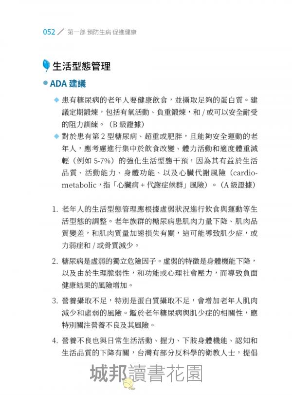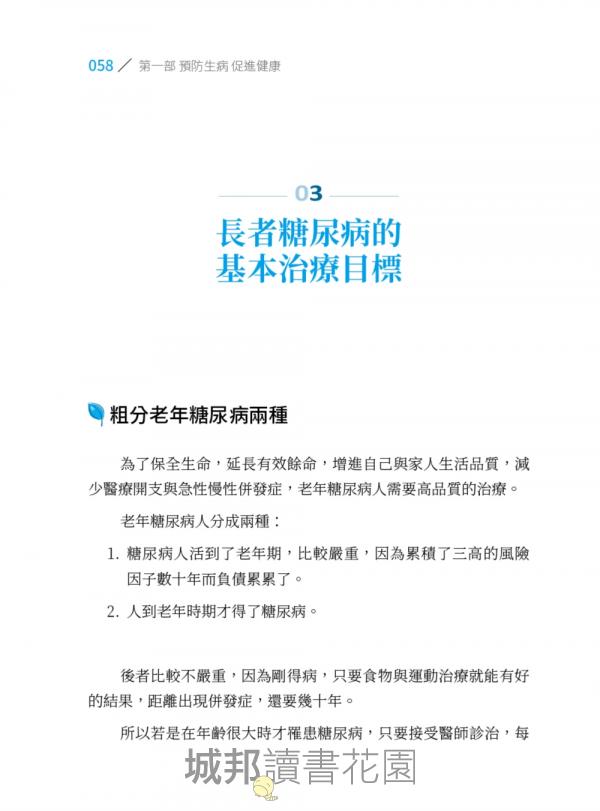 第一部〈預防生病 促進健康〉,奠定了全書的基礎。洪醫師提醒我們,在超高齡社會中,糖尿病、高血壓、高血脂症等「三高」疾病是影響長者健康的關鍵,必須認真看待,並且積極協同治療,以預防併發症,減少失能。最好能定期篩檢,以做到二級預防「早發現、早治療」,甚至是一級預防「未病先防治」。