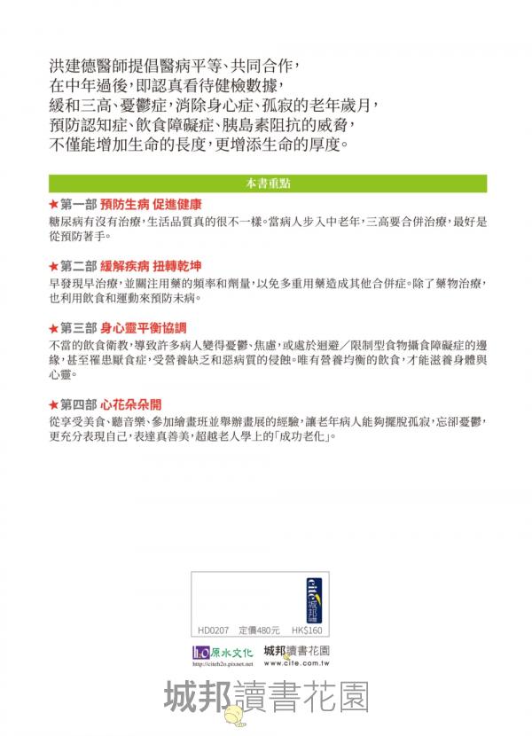 提倡醫病平等、共同合作,在中年過後,即認真看待健檢數據,緩和三高、憂鬱症,消除身心症、孤寂的老年歲月,預防認知症、飲食障礙症、胰島素阻抗的威脅,不僅能增加生命的長度,更增添生命的厚度。