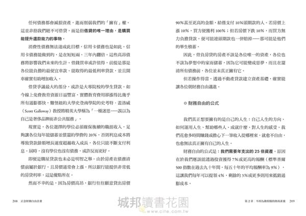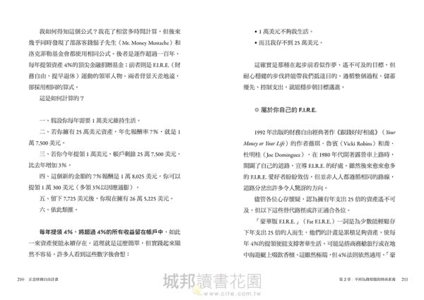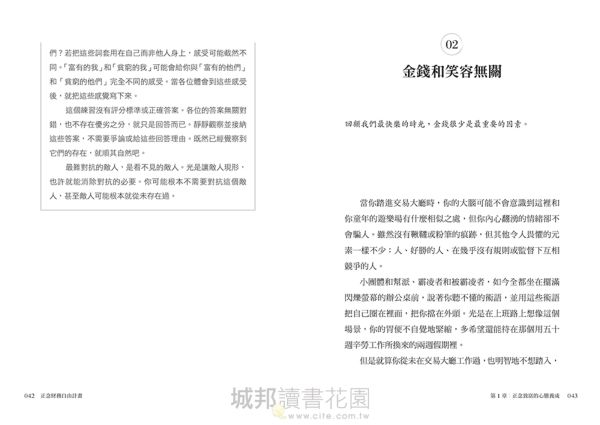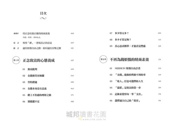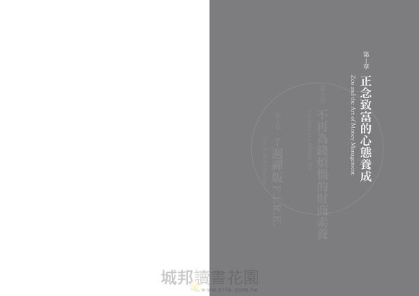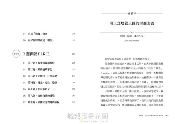 推薦序 用正念培養正確的財商素養/約翰–保羅.弗林托夫 引言  利用「禪」,實現真正的富足 前言  通往財務自由之路,如同通往涅槃之路 第1章 正念致富的心態養成 01 無須批判 02 金錢和笑容無關 03 害怕錯過 04 金錢本身沒有意義 05 踏上不焦慮的理財之路 06 別搖擺不定 07 多少算太多? 08 多少才算足夠? 09 真心追求簡單,才能看見豐盛 第2章 不再為錢煩惱的財商素養 01 MISSION財務自由計畫 02 「金錢」能做的與做不到的事 03 「收入」打造可選擇的人生 04 「儲蓄」是致富的第一步 05 記錄並覺察每一筆「支出」 06 選擇適合自己的「投資」 07 真正「擁有」資產 08 最好的時機就是「現在」 第3章 7週禪版F.I.R.E. 01 第一週:起步養成新習慣 02 第二週:禪的追蹤筆記 03 第三週:先爬行,打穩基礎 04 第四週:行走,專注,覺察 05 第五週:你可能錯了 06 第六週:突破自我的挑戰 07 第七週:展開正念理財的旅程