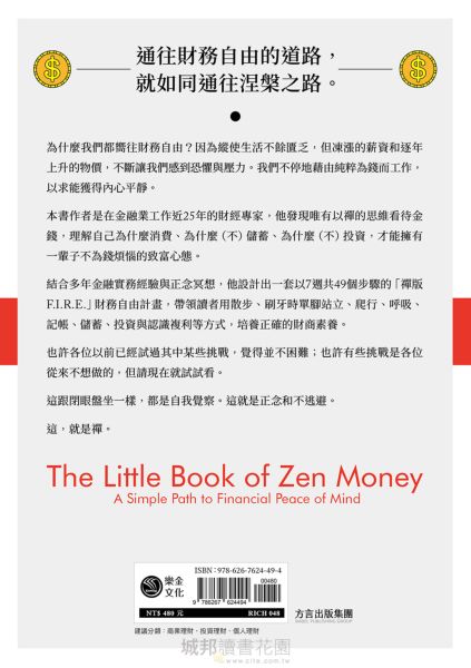 別以為財務自由只和「數字」有關。 其實理財不僅要懂得精打細算,更要學會如何自我覺察。 49個養錢步驟 × 校正財務心態 × 儲蓄永遠優先 × 長期複利思維 ◤通往財務自由的道路,就如同通往涅槃之路。◢ 為什麼我們都嚮往財務自由?因為縱使生活不餘匱乏,但凍漲的薪資和逐年上升的物價,不斷讓我們感到恐懼與壓力。我們不停地藉由純粹為錢而工作,以求能獲得內心平靜。 本書作者是在金融業工作近25年的財經專家,他發現唯有以禪的思維看待金錢,理解自己為什麼消費、為什麼(不)儲蓄、為什麼(不)投資,才能擁有一輩子不為錢煩惱的致富心態。 結合多年金融實務經驗與正念冥想,他設計出一套以7週共49個步驟的「禪版 F.I.R.E.」財務自由計畫,帶領讀者用散步、刷牙時單腳站立、爬行、呼吸、記帳、儲蓄、投資與認識複利等方式,培養正確的財商素養。 也許各位以前已經試過其中某些挑戰,覺得並不困難;也許有些挑戰是各位從來不想做的,但請現在就試試看。 這跟閉眼盤坐一樣,都是自我覺察。這就是正念和不逃避。 這,就是禪。