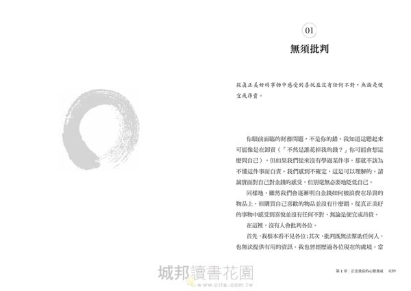 【引言】利用「禪」,實現真正的富足 很少有主題像「禪」與「金錢」這樣風馬牛不相及。這很可惜,因為將「禪」帶入我們的財務生活,可以為我們的許多金錢煩憂提供解答。這就是我希望本書能提供的。 從一個極端來看,如果我們再也不需要金錢,就能擁有無限的財務安全感,我們將可以用喜樂而平靜的心態看待金錢;從另一個極端來看,花掉人生中經手的每一分錢,則會讓我們永遠無法獲得那份平靜。 雖然永遠不需要錢可能就像任何禪宗公案一樣不可能達成,但朝著這個方向前進的道路,比起不停地支出這條更多人走的路來說,將能得到更大的平靜。希望本書,能成為幫助各位找到自己的路的指引。 理解金錢 其實有一些簡單的途徑可以讓我們建立財商思維,去了解金錢是什麼及它可以為我們做些什麼;這些知識能幫助我們所有人過上更好的生活,但是很少有人曾被指引過這些途徑。 我們每個人都在和金錢打交道,經常花更多時間來賺錢和花錢,卻很少有時間了解錢。我們其實可以更清楚地知道如何有效運用金錢、如何讓錢為我們工作,而不是反過來為了錢而工作。 光是轉變對金錢的了解,就可能會對世界產生巨大的影響,對幸福感、心理健康、不平等,甚至對地球本身都有影響。希望本書可以成為各位理解金錢的入口,引領各位通往一條簡單的道路,擺脫我們常常加諸於金錢之上的壓力。 禪與極簡主義 據我所知,佛教的思想從印度傳到中國,在那裡被稱為「禪」,並可能融入了道家思想,之後在八百年前傳到日本,並被稱作「zen」。有人認為印度傳統中表示深度冥想的「禪那」(dhyana),與「禪」大致上有著相同的詞源。 當我想到「禪」時,也許和各位一樣,我想到的是日文詞彙「zen」,因為它在西方已經有了自己的意涵:極簡主義之美的精妙展現。 我們可以在精心布置的枯山水庭園中看見禪,在以金線修補的破碎金繼(kintsugi)茶碗中看見禪,或在任何其他侘寂美學的安排中看見禪。 「禪」也存在於圓相(ensō)之中。這個概念如此簡單,就是畫一個完美的圓;卻又難以實現,因為每一個圓都不相同。它們是嚴謹練習的成果,卻出自平靜的心靈。看起來像是畫出一個零,卻代表著無限,一個回到自身起點的圓圈——幾乎要回到起點了。 我還將另一個概念納入「禪」,這來自一句據說是佛陀被問及最重要的教義時的回答:「無所住。」 這句話如此有力,雖然嚴格來說未必是「禪」,但它對「無」的強調,在我看來非常「禪」,如果禪也意味著極簡主義的話。 畢竟,還有什麼比「無」更極簡呢? 真正的黑暗,是缺乏財商教育 哲學家艾倫.沃茨(Alan Watts)對禪有一個簡單而美麗的描述:「直視現實」。 如果我們能直視現實,無論是觀看整個世界,還是觀看我們自己本身,都必須承認一件事:我們跟金錢的關係真的出了問題。 雖然過去幾十來年,全球生活在貧困中的人口數量已大幅下降,但許多已開發國家的貧窮人口比例仍然高得驚人,尤其是考量到這些國家在其他方面的富裕程度。在一些國家,貧窮人口比例甚至還在上升。 美國人口普查局在2019年估計,10.5%的人口生活在貧窮線以下;而英國政府則使用不同的定義,在2020年將高達23%的家庭列為低收入戶,高於幾年前的18%。那些低於貧窮線的人們,他們的金錢壓力來自真實的金錢問題,而這些問題只能靠更多的錢才能解決。遺憾的是,本書無法幫助解決這種情況。如果可以就好了。 我希望本書能提供其他答案,幫助這些人走出自己的路,像是如何處理目前困境所帶來的壓力,讓他們在未來幸運地有了足夠的錢以後,可以避開這些問題。 而對於我們其他在貧窮線以上的人來說,我們的財務壓力或許可以稱為「金錢憂慮」或「焦慮」,而不是「金錢問題」。這些擔憂以多種方式呈現,原因也各不相同,有的人只是因為拿不定主意而遲遲不敢行動;有的人則是做了錯誤的決定而欠下大筆債務;有的人則是長期感到心神不寧甚至羞愧等等。 幾乎全世界的人都缺乏正規的財商教育,這使得問題雪上加霜。 雖然這種財務壓力不像貧窮那樣處處受限,但對於承受這種壓力的人來說,感覺上同樣真實,只是問題的根源不是金錢不足,而是我們從未被教導過關於金錢的知識。我們就好像生活在黑暗中一樣。 我們都知道,當燈光亮起時,黑暗本身並沒有什麼可怕的。我們可能身處在一個熟悉的地方,但因為看不清楚其他事物,所以會感到不確定,甚至有點害怕。當我們試著思考金錢時,經常會感到同樣的恐懼。 我們需要開始了解金錢,了解金錢能為我們做些什麼,以及我們又能怎麼運用金錢。只要稍微理解一點,就會有很大的幫助。 收入曲線下的貧富鴻溝 與對黑暗的恐懼不同,我們對金錢感到壓力確實事出有因。已開發國家的貧困問題不但持續存在,甚至更加嚴重,主要原因在於數十年來不斷擴大的貧富差距。美國經濟政策研究所的數據顯示,1978年至2018年間,企業執行長的平均收入成長超過1,000%,而一般勞工的收入只增加了11%。假設通貨膨脹率在2%左右,那麼企業執行長的平均生活水準將提高5倍,而一般人的生活水準則會減半。 在大多數英語系國家,富裕階層的年收入成長速度,遠遠超過收入曲線低於他們的人。富者確實愈來愈富。結果,收入曲線和由此產生的財富曲線變得更加陡峭,能賺取高薪的人愈來愈少,極少數人卻擁有巨額財富——真正達到天文數字的財富,