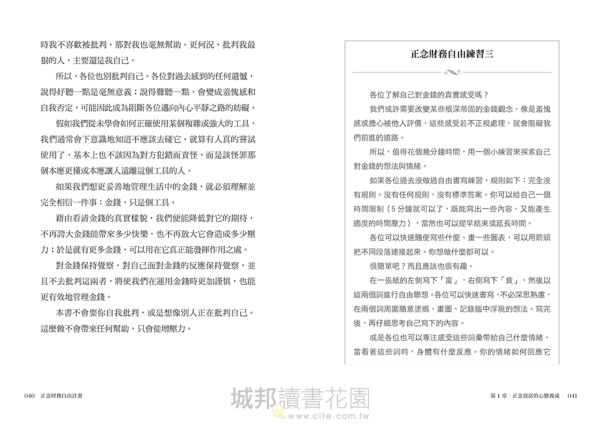 各界推薦── Jet Lee|「Jet Lee的投資隨筆」版主 丁彥鈞|證券分析師 老墨Mofi|美股台股投資人 派屈克.詹金斯|《金融時報》副總編輯 何瑞明|「覺醒社畜」網站聯合創辦人,著有《覺醒社畜的贏家理財課》 約翰–保羅.弗林托夫|英國知名記者、作家暨廣播節目主持人,《如何改變世界》作者 科本納.費茲派屈克|個人理財記者 出口信也|全球第一部投資網路漫畫《INVEST!》共同製作人 湯姆.霍金森|《懶蟲》雜誌編輯 「這本書寫的,就是我親身體驗過的事。很多人以為金錢的問題靠努力、靠技巧就能解決,但真正的關鍵是覺察:看見自己和錢的關係。我看過太多人卡在這一步,過於急躁想賺錢,但不開始覺察自己的能量狀態。非常推薦這本書。」 ——老墨Mofi,美股台股投資人 「一趟引人入勝且賦予力量的探索,證明了一個簡單但深刻的道理:一點財務知識就能引領我們走向更平靜的人生。」 ——派屈克.詹金斯(Patrick Jenkins),《金融時報》副總編輯 「每個人為了獲得財務安心所需付出的代價經常被忽略。沒錯,代價並不低,但也不是高得離譜。只有透過自我反思,各位才能找到屬於自己的最佳平衡點。讓這本書成為各位的起點吧。」 ——何瑞明,「覺醒社畜」(The Woke Salaryman)網站聯合創辦人,著有《覺醒社畜的贏家理財課》 「真希望我年輕的時候就有幸能夠讀到這本書,這樣就能避免在發生財務危機時,對我造成沉重打擊的恐懼和羞恥的痛苦了。」 ——約翰–保羅.弗林托夫,英國知名記者、作家暨廣播節目主持人,《如何改變世界》作者 「終於有一本書教導金錢正念,幫助各位放下面對財務時常有的壓力、恐懼和困惑。」 ——科本納.費茲派屈克(Kalpana Fitzpatrick),個人理財記者 「我們大多數人討厭照鏡子,因為鏡中的自己離理想很遠。銀行帳戶不也是如此嗎?面對自己的財務弱點既困難又令人害怕。這本書能給各位足夠的勇氣,為美好的未來跨出第一小步。」 ——出口信也(Shinya Deguchi),全球第一部投資網路漫畫《INVEST!》共同製作人 「太精彩了!我現在對金錢和禪有了更深的認識,也明白兩者如何相輔相成!」 ——湯姆.霍金森(Tom Hodgkinson),《懶蟲》(The Idler)雜誌編輯