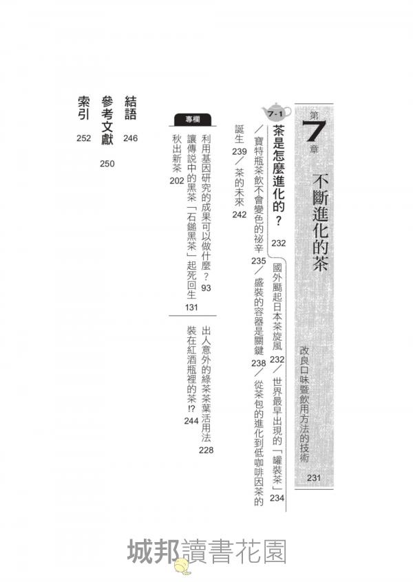 7-1 茶是怎麼進化的? 國外颳起日本茶旋風 / 世界最早出現的「罐裝茶」 / 寶特瓶茶飲不會變色的秘辛 / 盛裝的容器是關鍵 / 從茶包的進化到低咖啡因茶的誕生 / 茶的未來