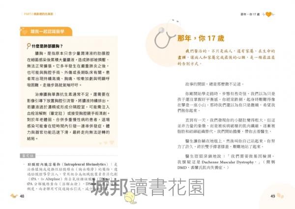 如今,欣見Rachel把精彩的故事集結成冊。這不只是一本醫學科普書籍,也是一本教你如何勇敢自信、同理關懷、有溫度的優良讀物。不只是適合父母、一般民眾、中學生、醫學生,也很適合醫療人員閱讀,誠心推薦給您!