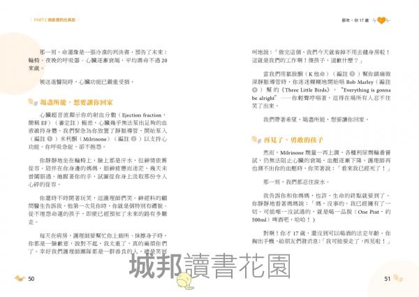 .溫暖感人的生命故事:書中記錄了無數孩子與家人勇敢面對病痛、掙扎求生,以及有時不得不面對臨終告別的真實故事,傳遞溫柔與希望。